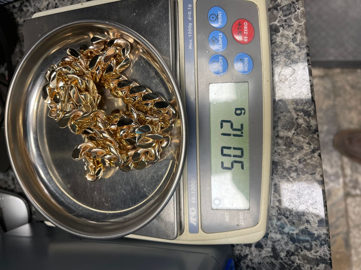 10k yellow gold cuban link necklace weighing 501.2 grams with a length of 28 inches and a width of 17mm.