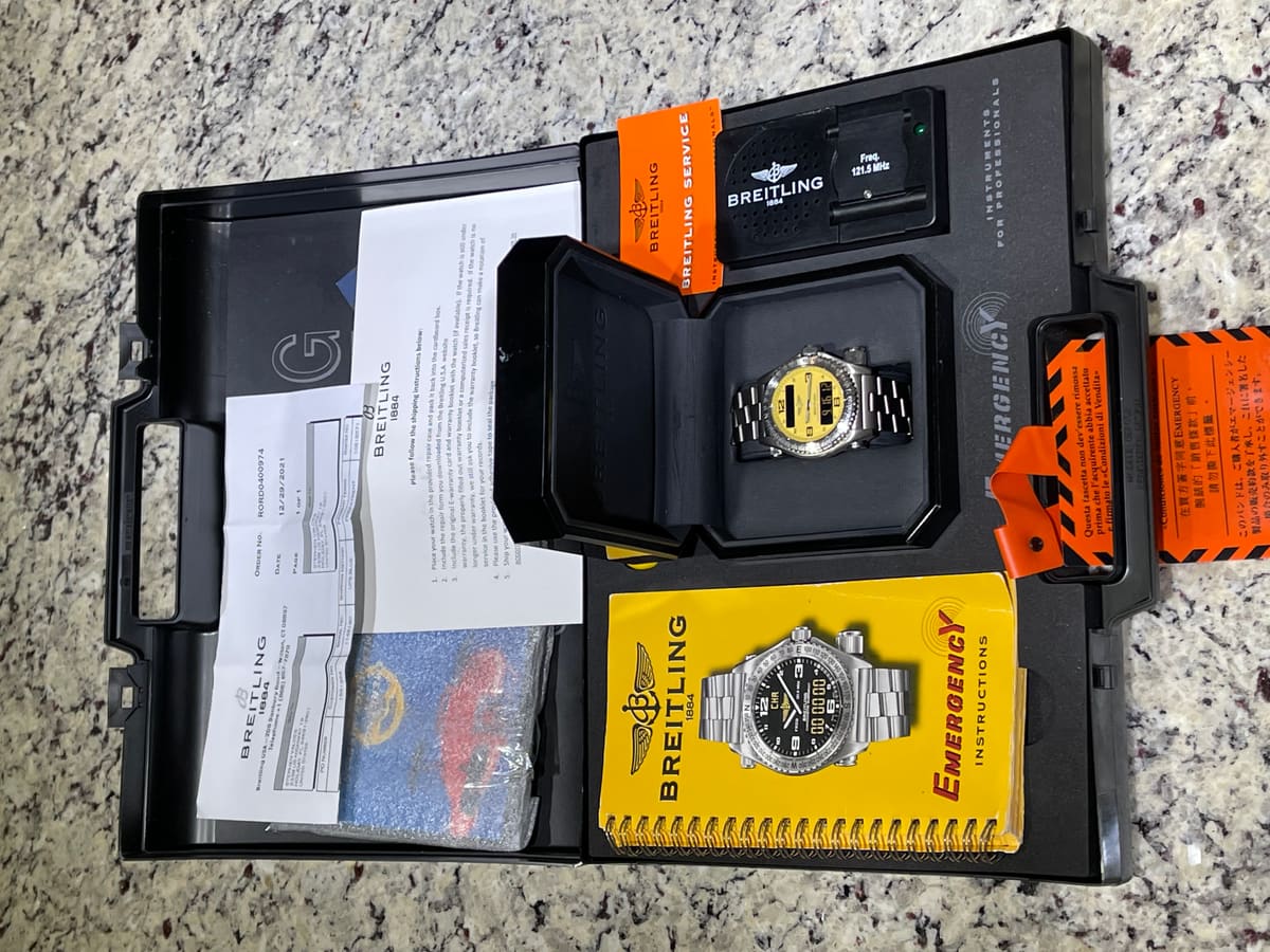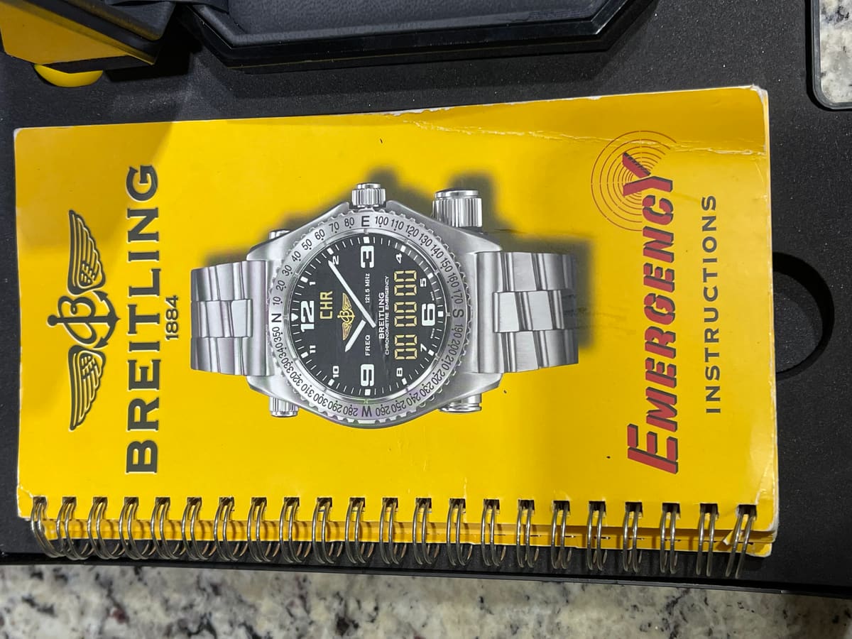 Breitling Emergency watch. This watch is all lightweight titanium. It has a function that can save your life if you pull the antenna out, someone will come find you. This watch has been fully serviced and polished by Breitling and comes with the full kit and case including the tester.