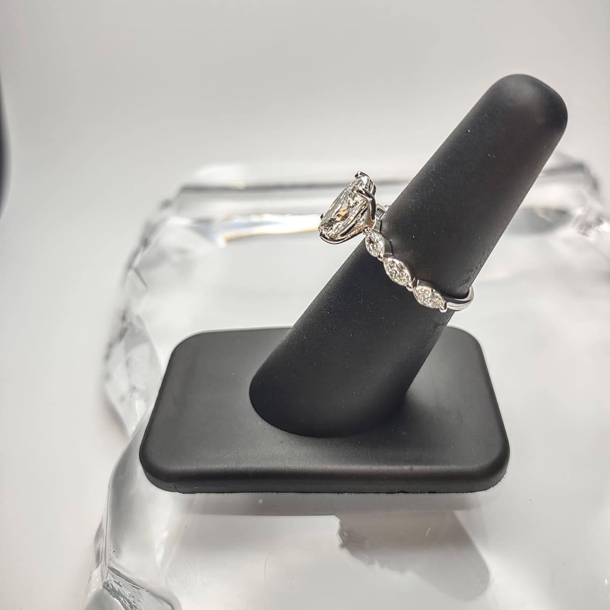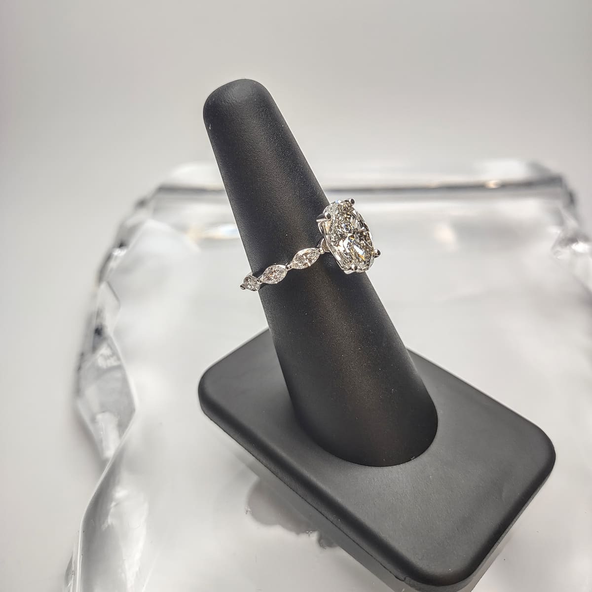 We just set this IMMACULATE 2.5 carat, GIA certified, brilliant oval cut diamond with an SI2-G grading, into this from scratch-custom 14kt white gold semi mount! With .68 carats in the semi mount, this ring totals 3.18 carats and will blind any set of eyes it comes in contact with! Come down and let us create your dream ring today!