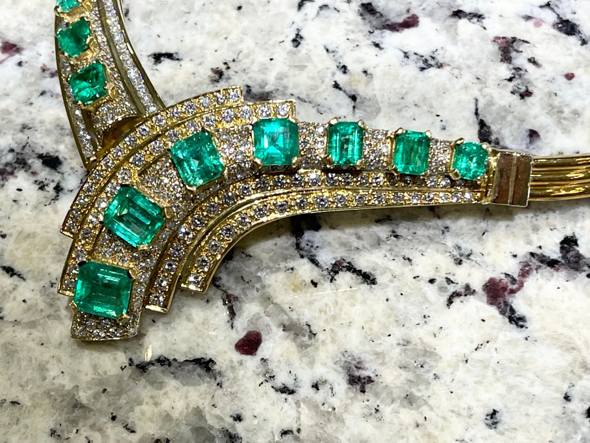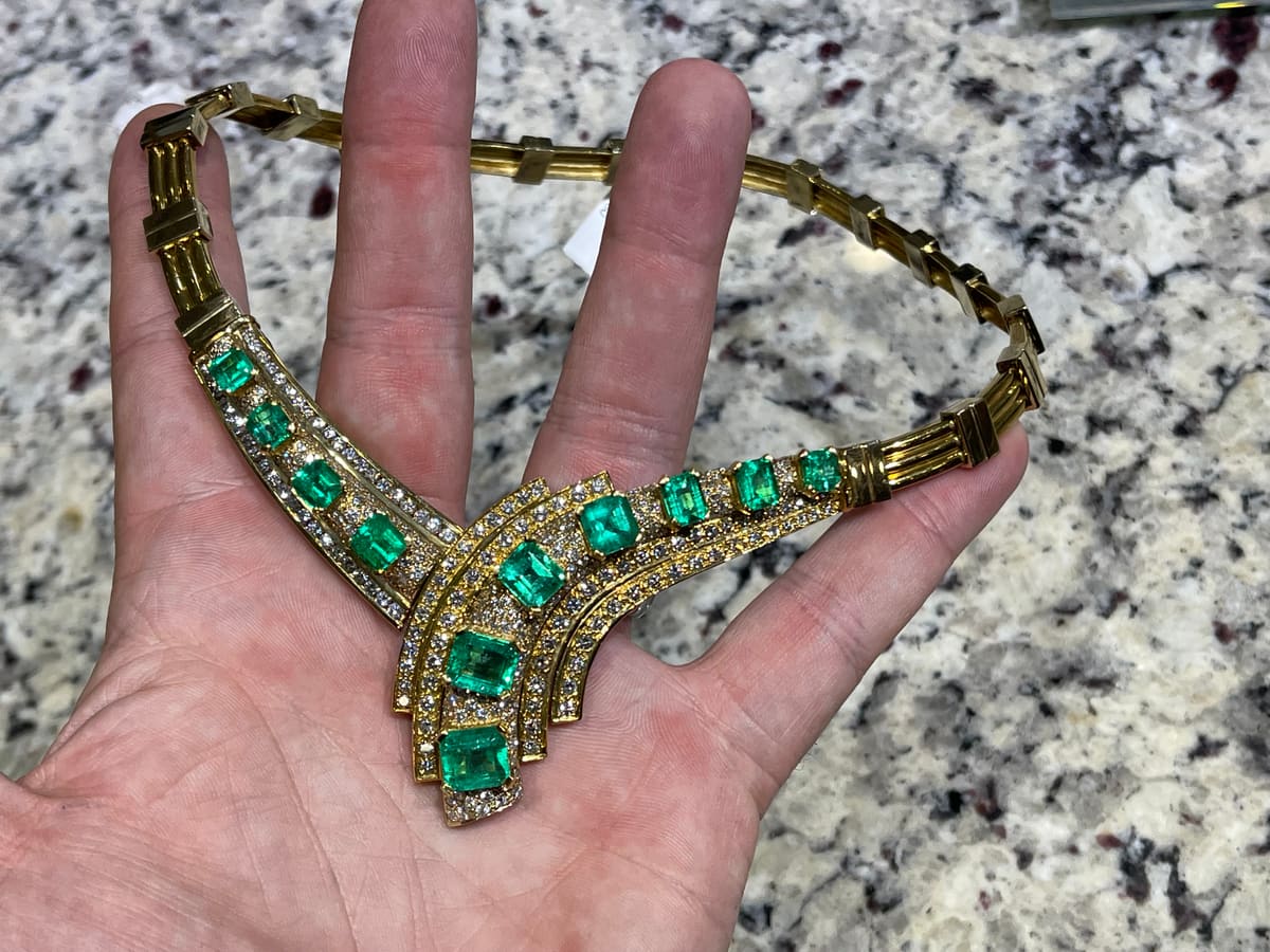 This is a custom, one of a kind, 18k gold, emerald and diamond necklace. There are approximately 15.96 carats of emeralds and approximately 11.96 carats of diamonds.