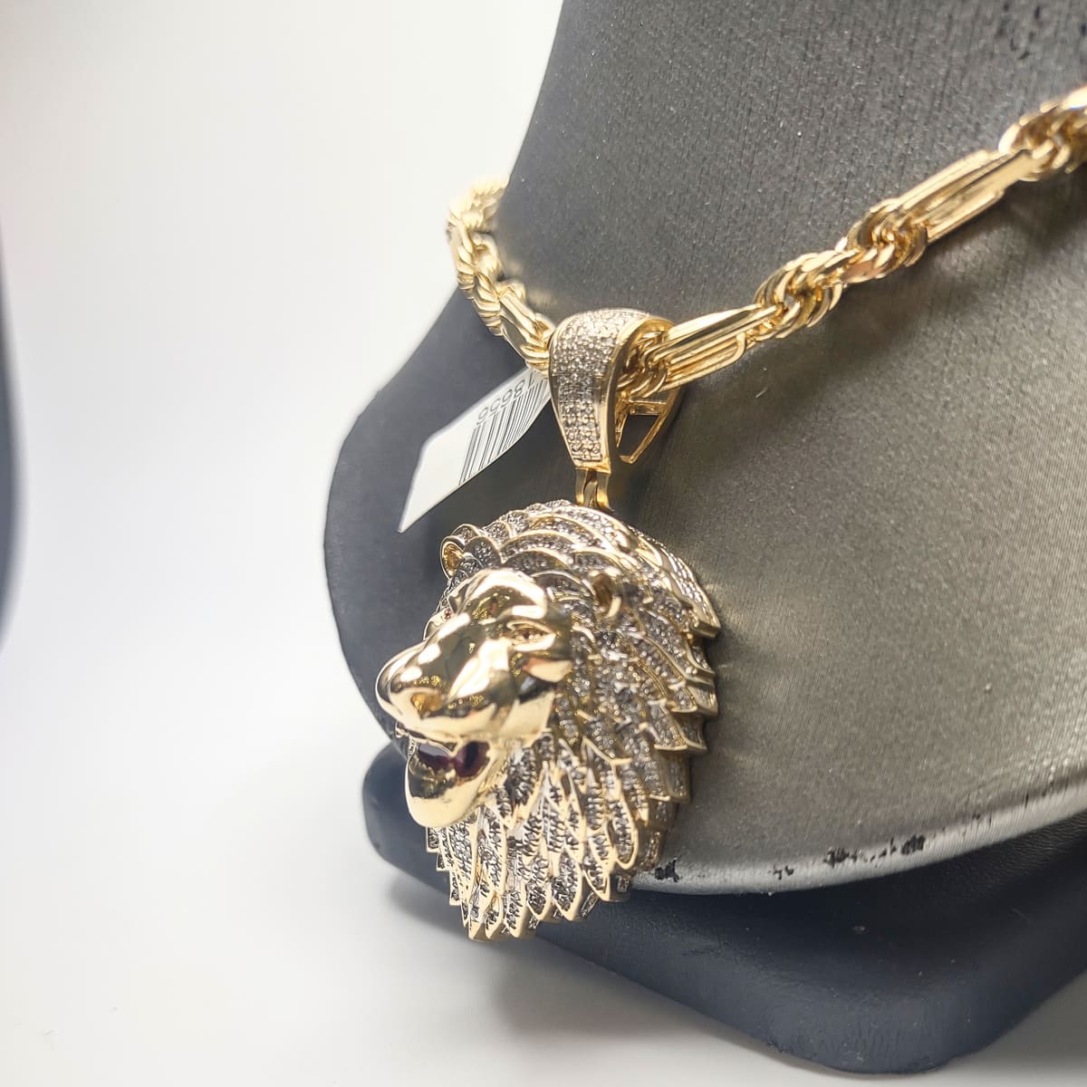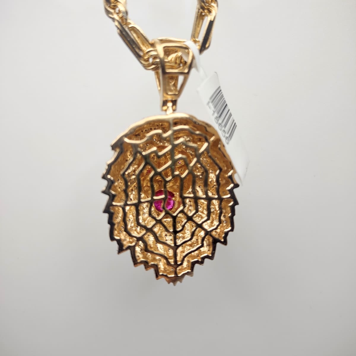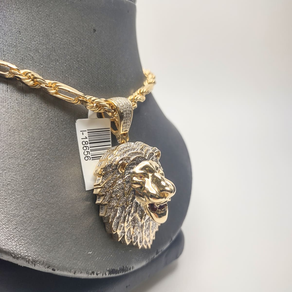 10 Karat yellow gold lion head, with 1.00ct of diamonds flowing through it's mane, fearless ruby eyes, and a chunky round ruby inbetween its teeth. Makes this charm weigh in at a solid 23.50g.