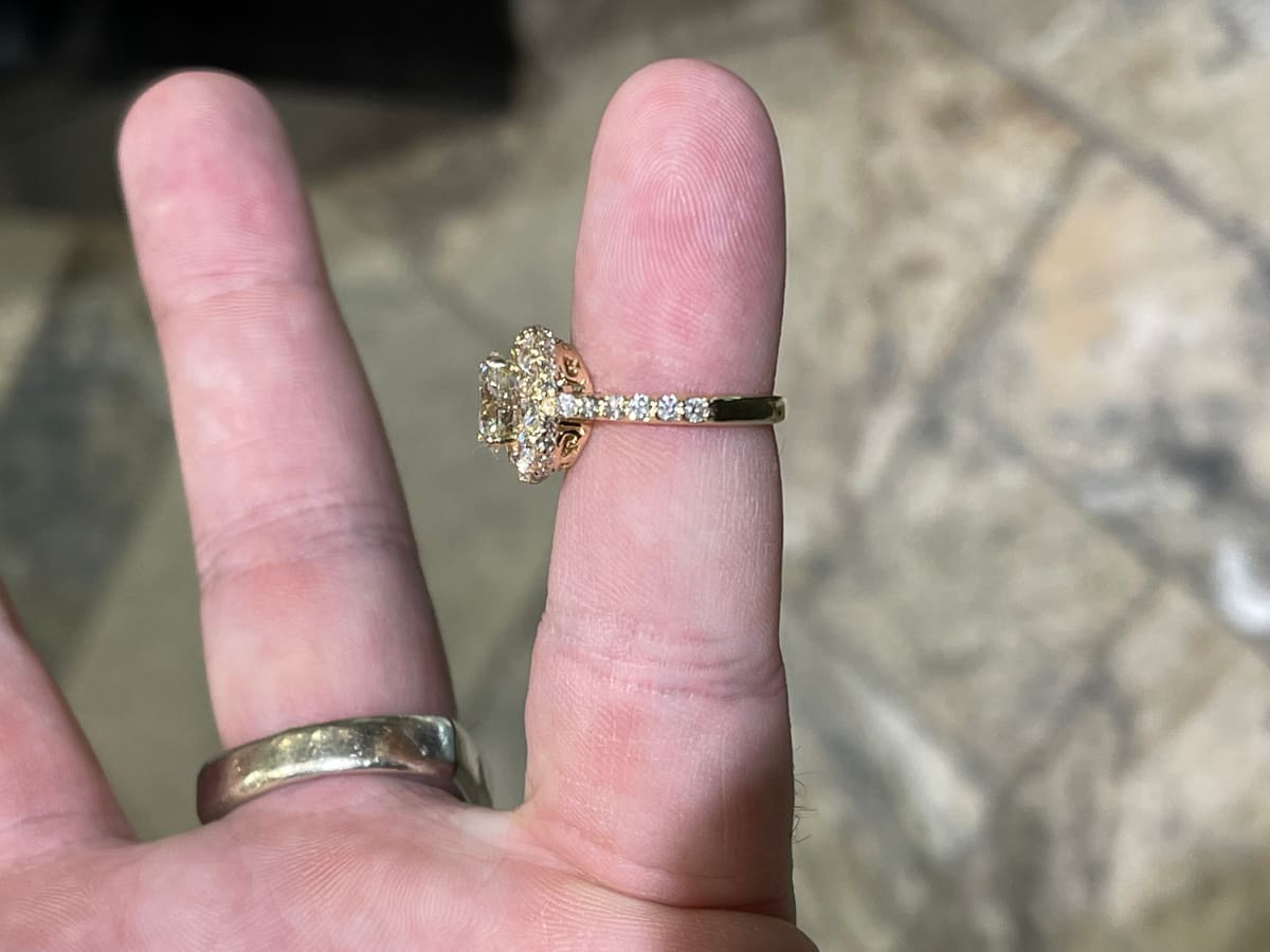 14k yellow gold diamond halo engagement ring 5.0 grams size 5.75. The center diamond is approximately 2.21 carat i1 clarity K color. The total weight of all the diamonds is approximately 3.73 carats.