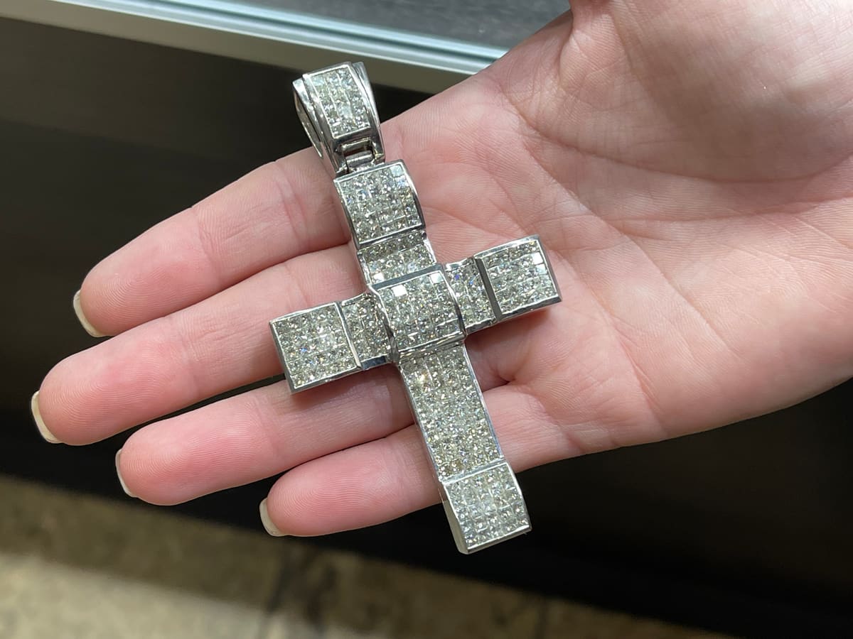 14k White Gold Diamond Cross Charm. This amazing cross charm contains approximately 13 carats of diamonds and weighs 50 grams. This is a large cross so please check the dimensions. The diamonds are invisible set. The dimensions are 3.25" tall, 2" wide and 0.5" deep.