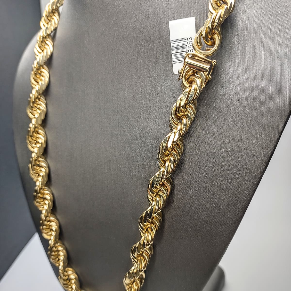 10kt yellow gold solid rope necklace weighing 201.4g it has a length of 23.25" and a width of 11mm.