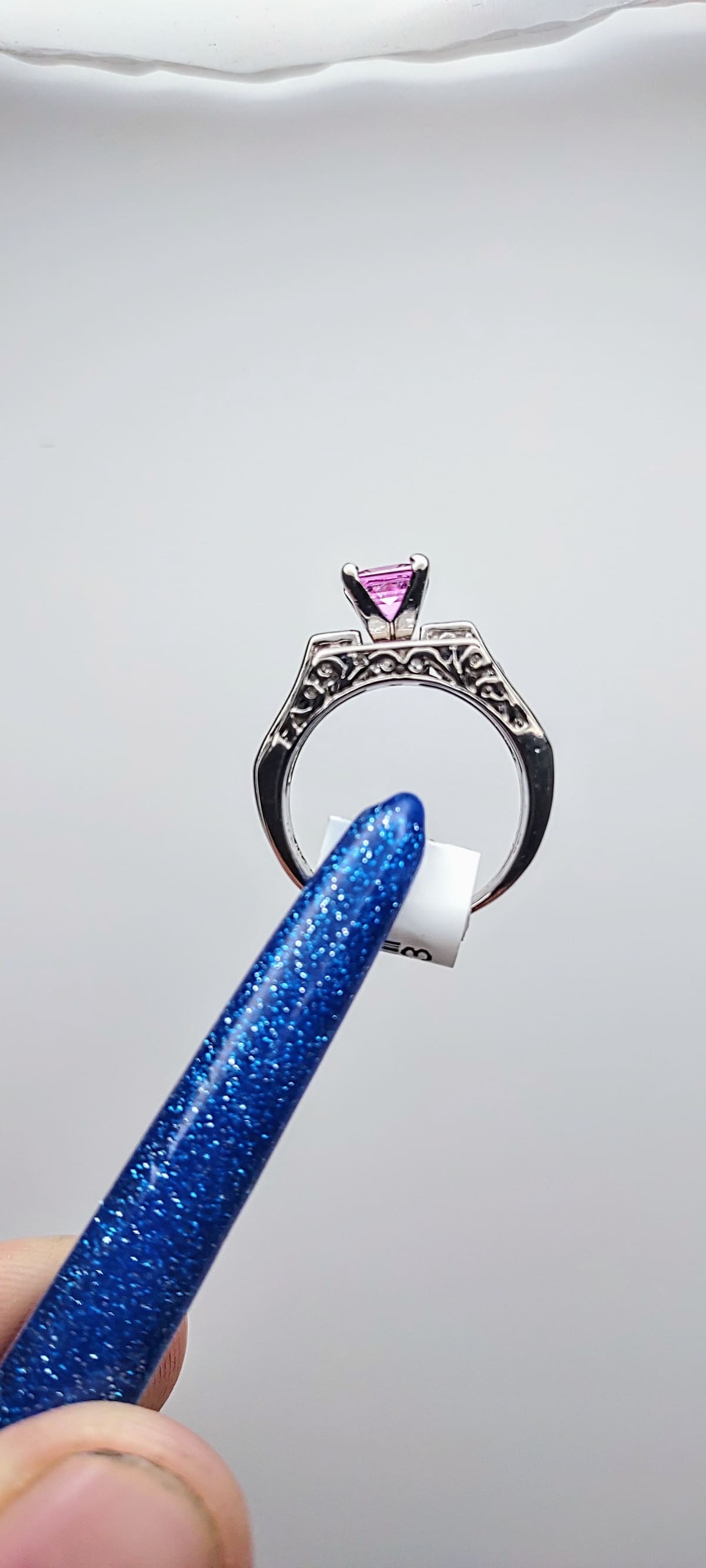 14KT WHITE GOLD WEDDING SET. NATURAL PINK SAPPHIRE CENTER STONE WITH NATURAL BLUE SAPPHIRE AND DIAMOND STONES WEIGHING 6.9 GRAMS. COMES WITH AN APPRAISAL WITH A REPLACEMENT VALUE OF $4,520.00