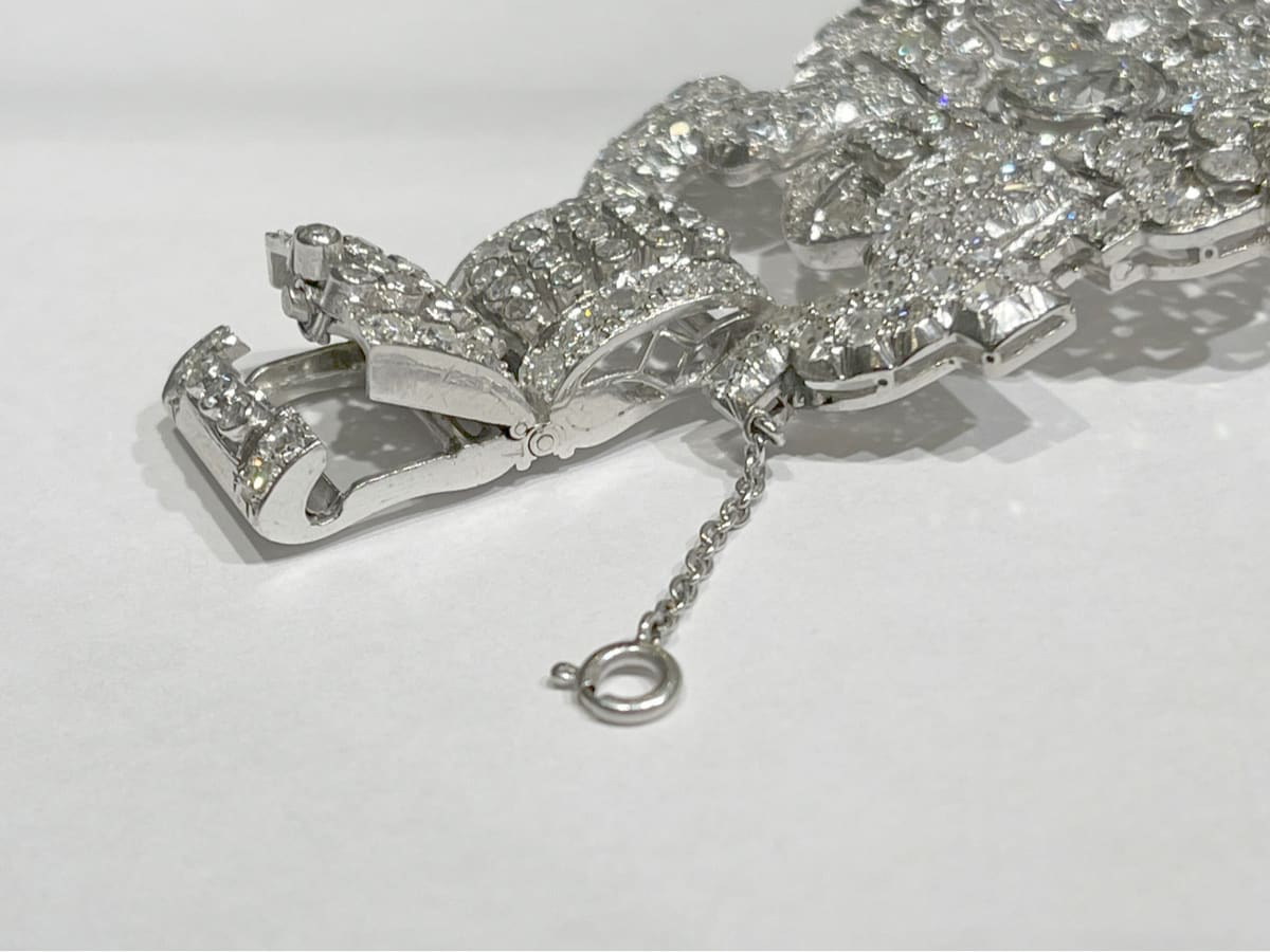 This is a one of a kind, custom made bracelet set in 100 grams of Platinum. The three center stones are over 2 carts each and the bracelet contains over 32 carats of diamonds total.